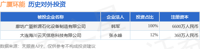 本站消息,根据天眼查APP显示,广厦环能(920703.BJ)新增一起对外投资事件,被投资公司为廊坊广厦新源石化设备制造有限公司,法定代表人韩军,投资占比为100%。该公司从事仪器仪表制造业,注册资本为6600万人民币。目前,广厦环能共存在对外投资2项奕道配资,详见下表: