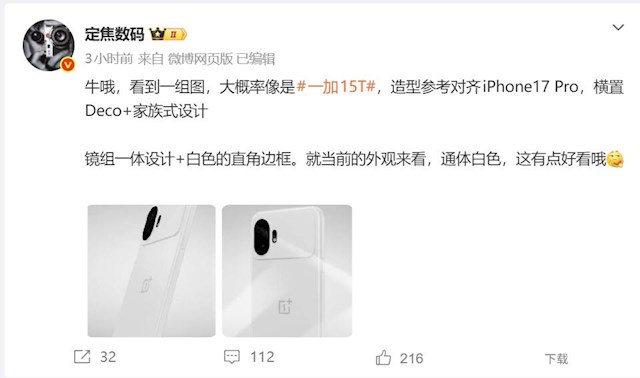 在正式官宣之前,一加15T的外观设计已在社交平台上意外流出。该机采用了极为纯净的白色机身,背部摄像头模组则选用了视觉冲击力极强的横向大矩阵设计。